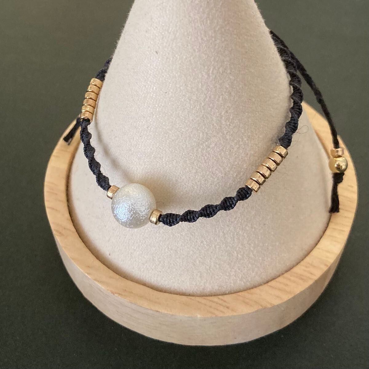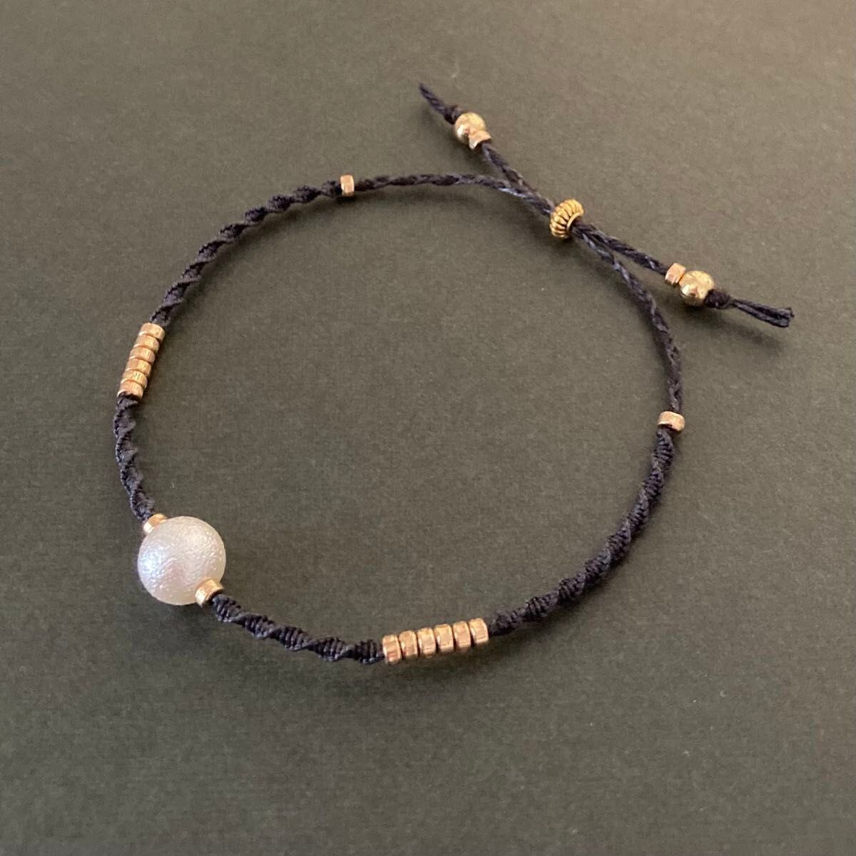 ハンドメイド [ 2582 ] ヘンプ ブレスレット 15〜25cm ブラック コットンパール調ビーズ