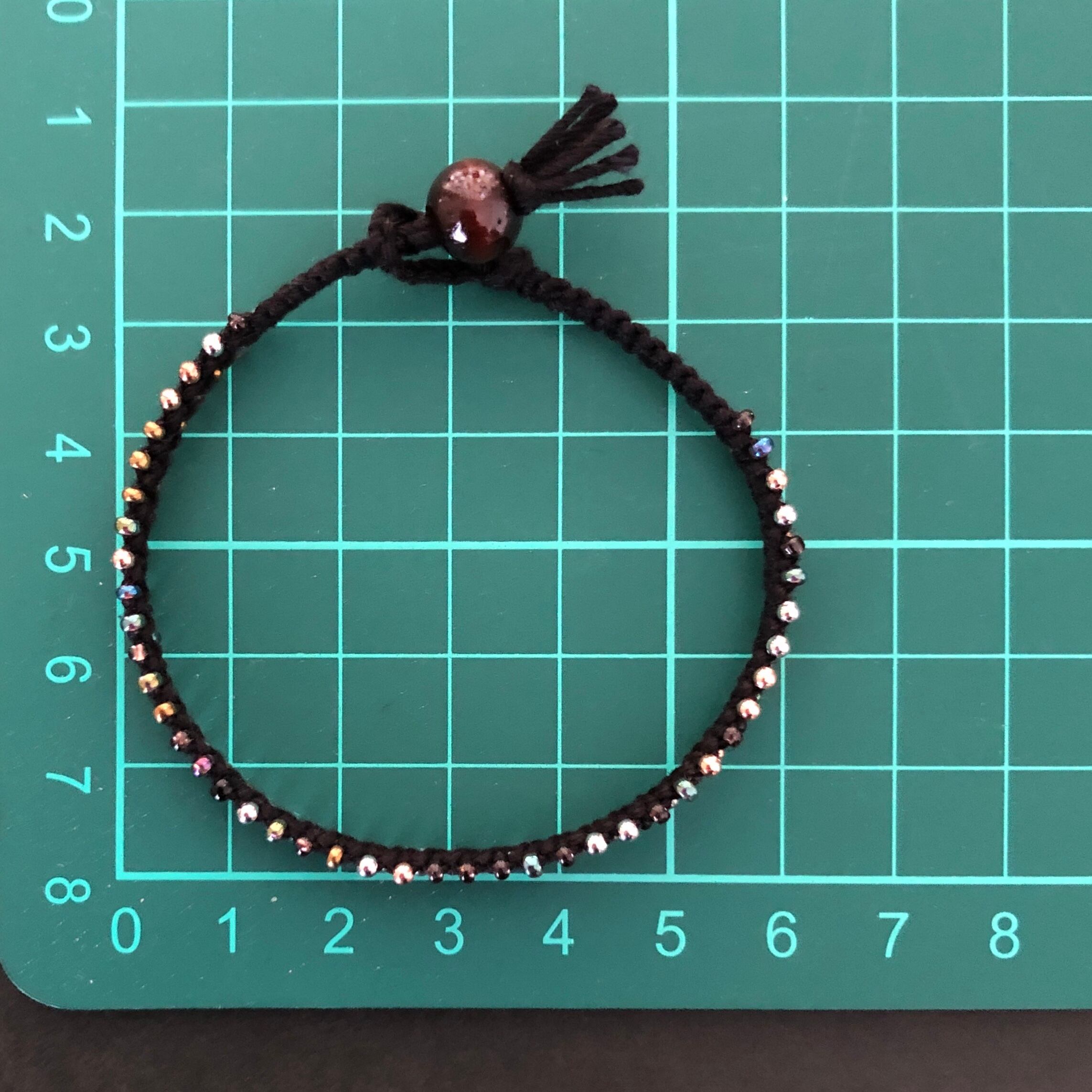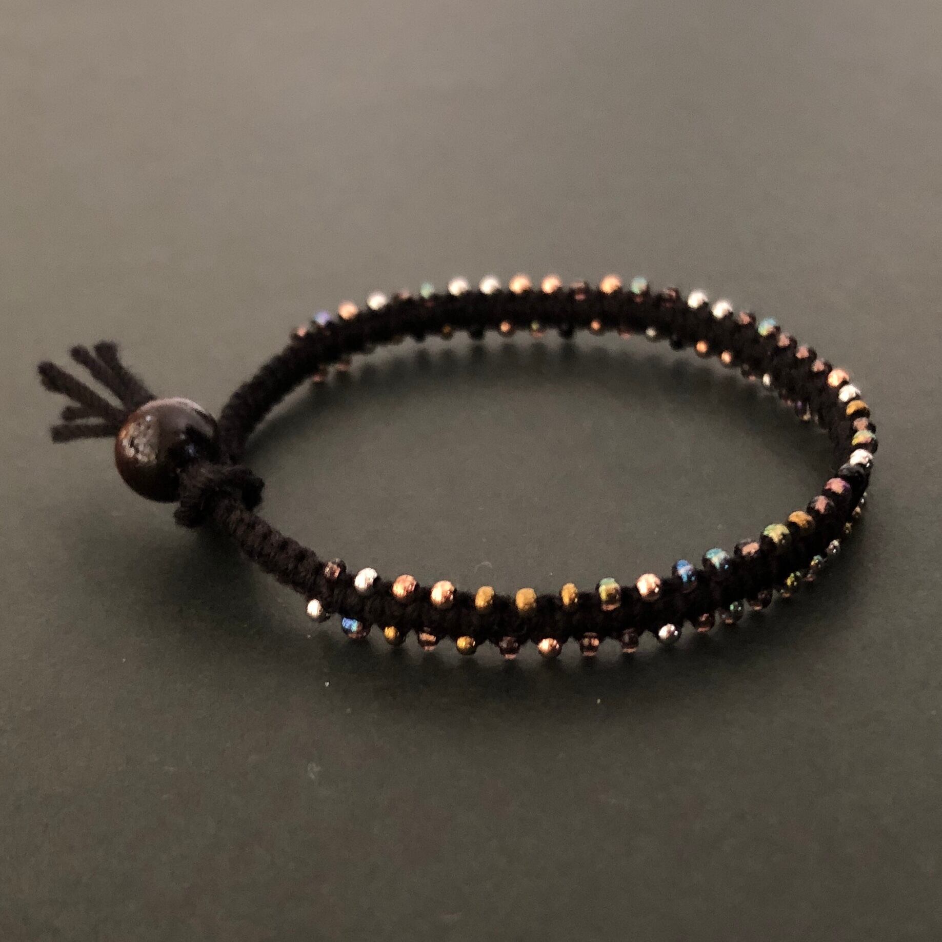 シンプルな平結びの両サイドにメタリックなシードビーズを並べて編み込みました。