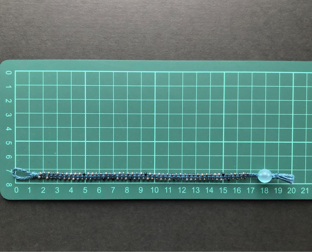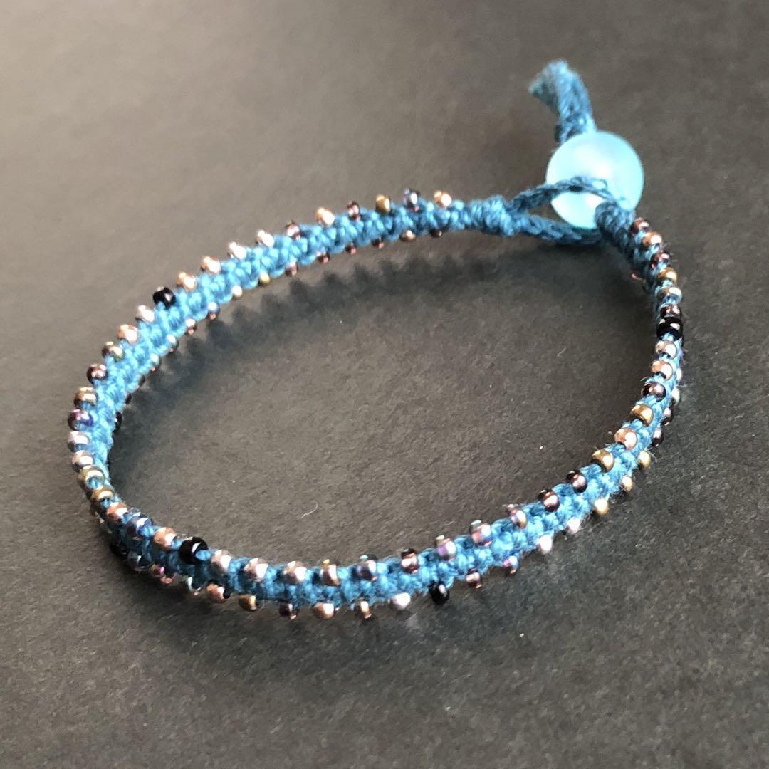 シンプルな平結びの両サイドにメタリックなシードビーズを並べて編み込みました。